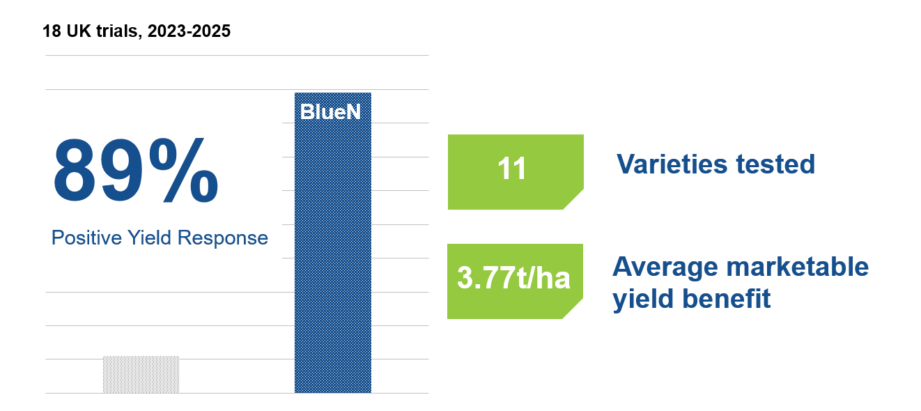 Potato trials conducted during 2023-2025 demonstrated that BlueN increased marketable yield by an average of 3.77 t/ha compared with the control plots.