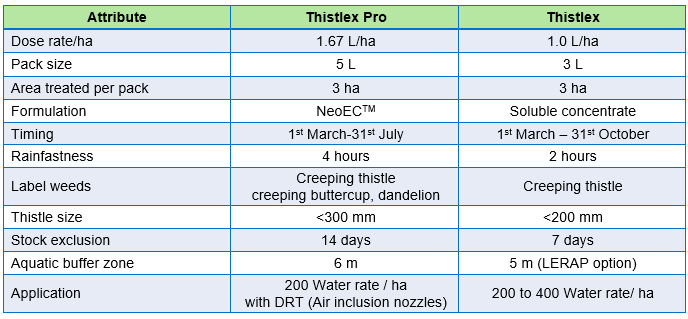 New for 2026, Thistlex® Pro, containing Arylex™ active, is a broad-spectrum replacement for Thistlex. It controls all species of thistles and buttercups as well as dandelions, hogweed and cow parsley. The label restricts use to grassland grazed by cattle or sheep only.
