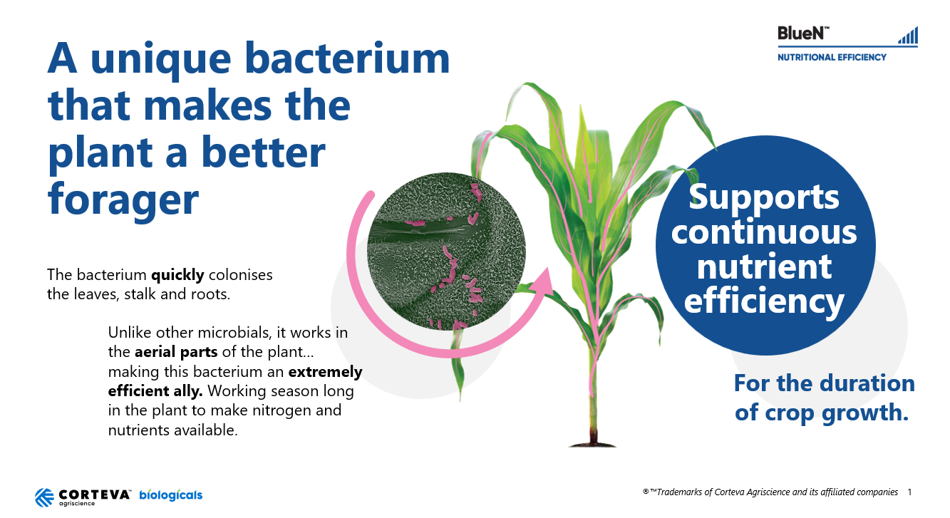 BlueN is a nutrient efficiency biostimulant for use in a broad range of crops including maize. It contains Methylobacterium symbioticum, a bacteria found in nature.