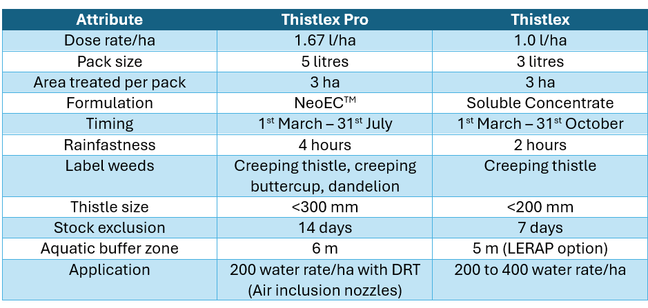 New for 2026, Thistlex Pro, containing Arylex™ active, is a broad-spectrum replacement for Thistlex. It controls all species of thistles and buttercups as well as dandelions, hogweed and cow parsley. The label restricts use to grassland grazed by cattle or sheep only.